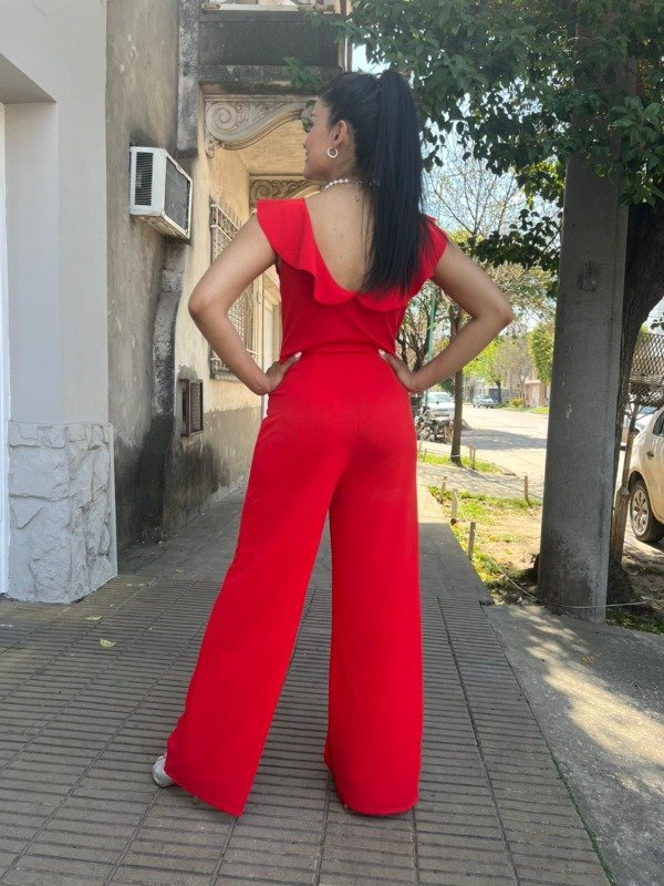 El escote en pico está enmarcado por delicados volantes que caen suavemente sobre los hombros, creando un movimiento etéreo y sofisticado. La silueta se ajusta en la cintura y se abre en unas espectaculares piernas palazzo, que no solo estilizan la figura, sino que también añaden un aire dramático y lleno de glamour.