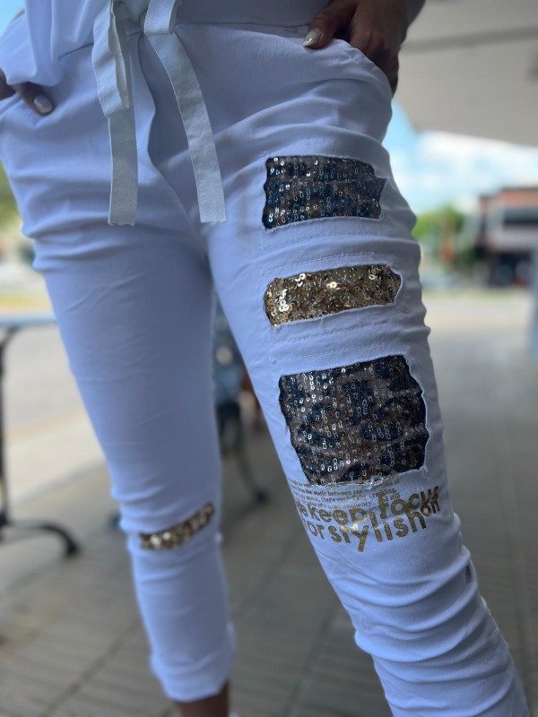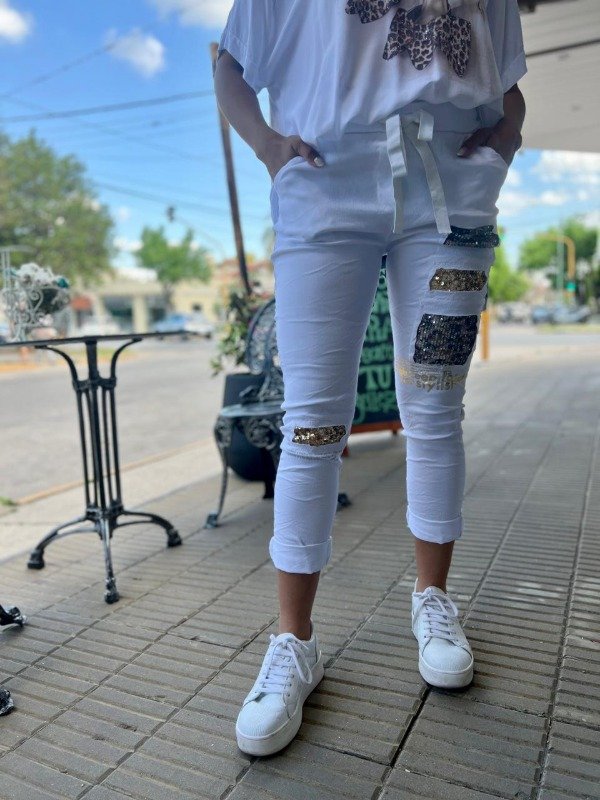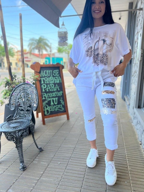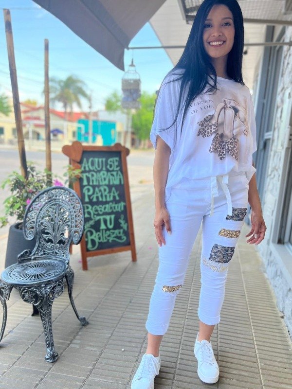 Es un diseño de babucha, con piernas semi-ajustadas y fruncidas. El ruedo se lleva doblado hacia arriba, y la cintura es elástica o con ajuste de cordón de tela ancho y plano en el mismo color blanco. Incluye bolsillos laterales funcionales con un corte sencillo .La exclusividad de la prenda reside en los apliques de parches rectangulares que simulan roturas reparadas de manera lujosa, ubicados en la parte frontal de las piernas. Presenta lentejuelas doradas o bronce que aportan un brillo cálido y elegante. Muestra un vibrante patrón de animal print cubierto con una capa de lentejuelas doradas o bronce, fusionando la tendencia animalista con el glamour. Se observan pequeños parches de lentejuelas doradas en el área de la rodilla o el tobillo, manteniendo la cohesión visual del brillo. En la parte inferior de una de las piernas, lleva un mensaje con foil en color dorado con una tipografía ¡