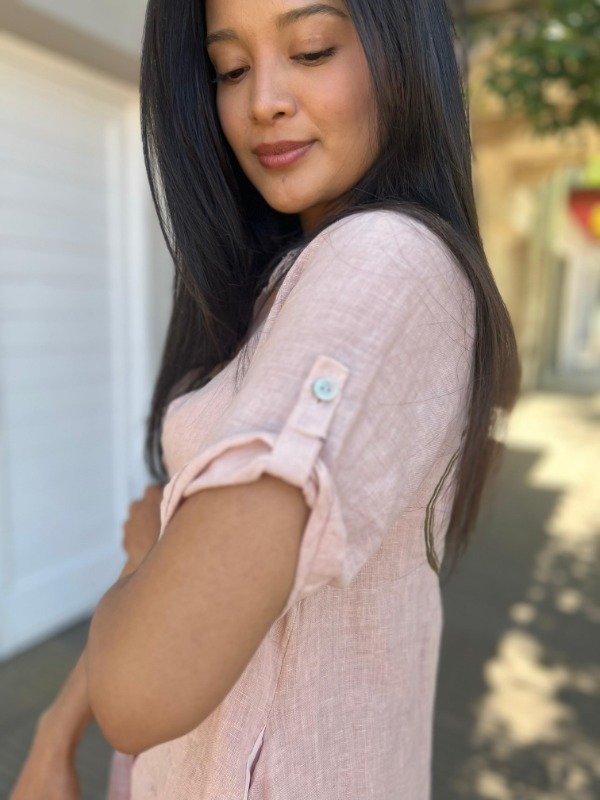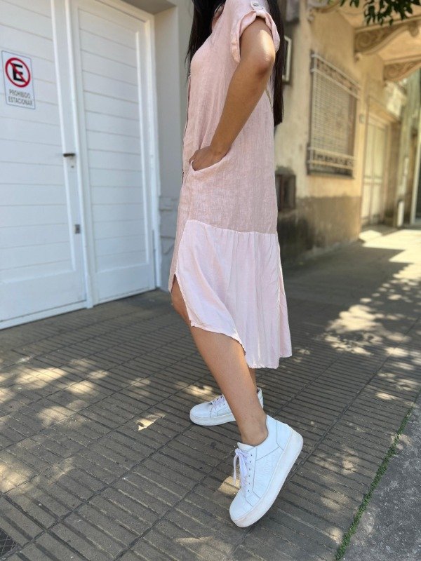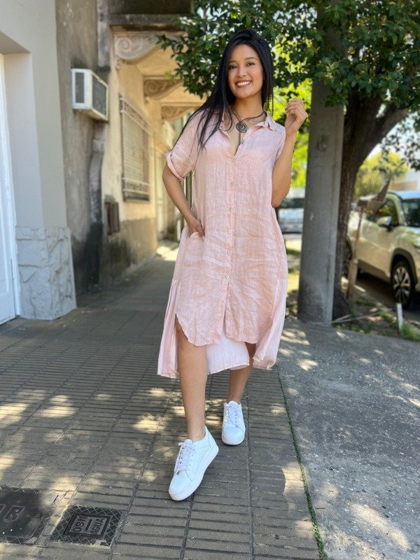Confeccionada en una mezcla de lino y algodón ligera, ofrece una textura fresca y una caída suave, ideal para los días de calor. Su corte camisero midi es holgado y funcional, con bolsillos laterales y un delicado volante fruncido en el bajo que le da un movimiento sutil y asimétrico. Las mangas se pueden remangar y ajustar para un look más casual.