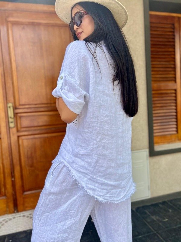Confeccionada en un tejido de lino/algodón en un blanco prístino, su diseño es la quintaesencia del chic relajado, ideal para acompañarte en los días de sol y brisa.