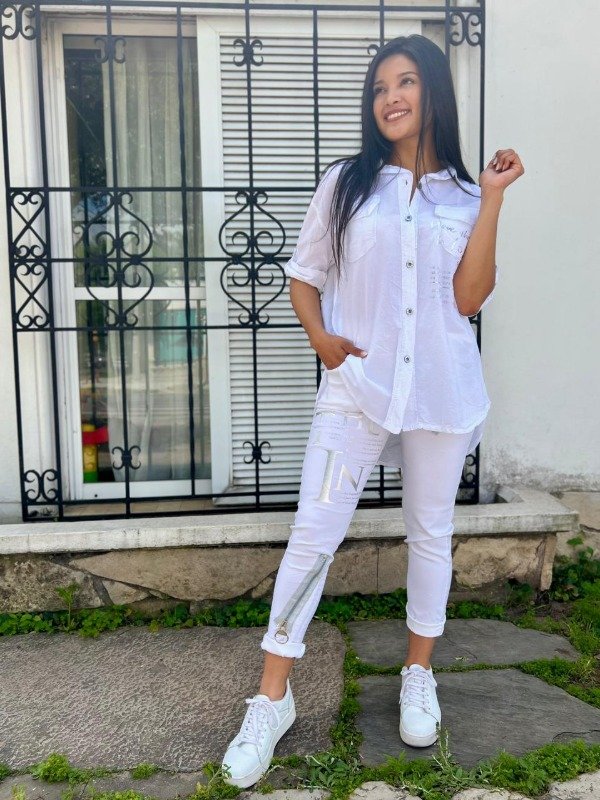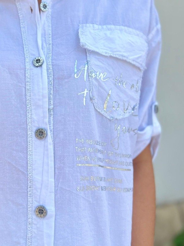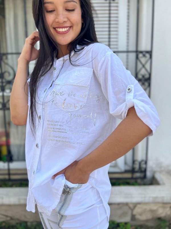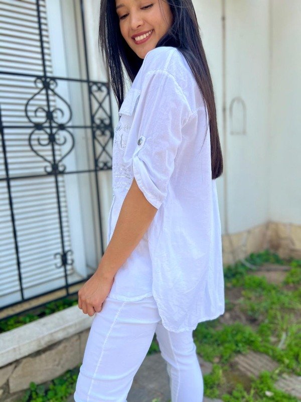Confeccionada en un tejido ligero y vaporoso en un inmaculado color blanco puro, esta camisa te envuelve en una sensación de libertad y confort absoluto, perfecta para los días cálidos.