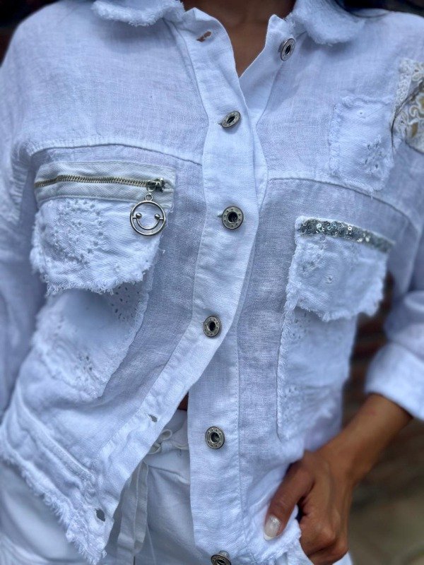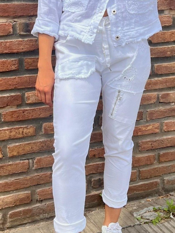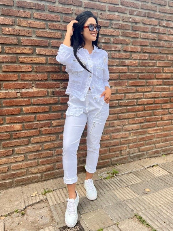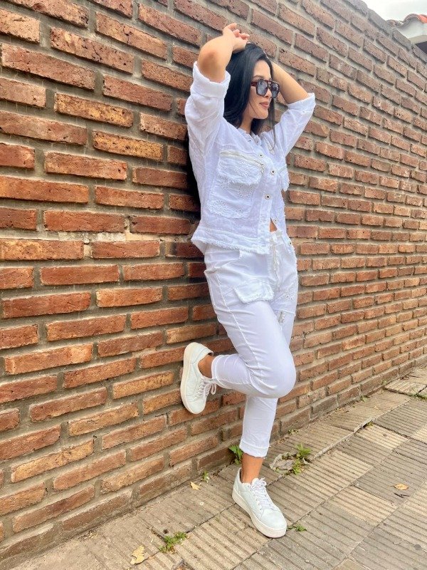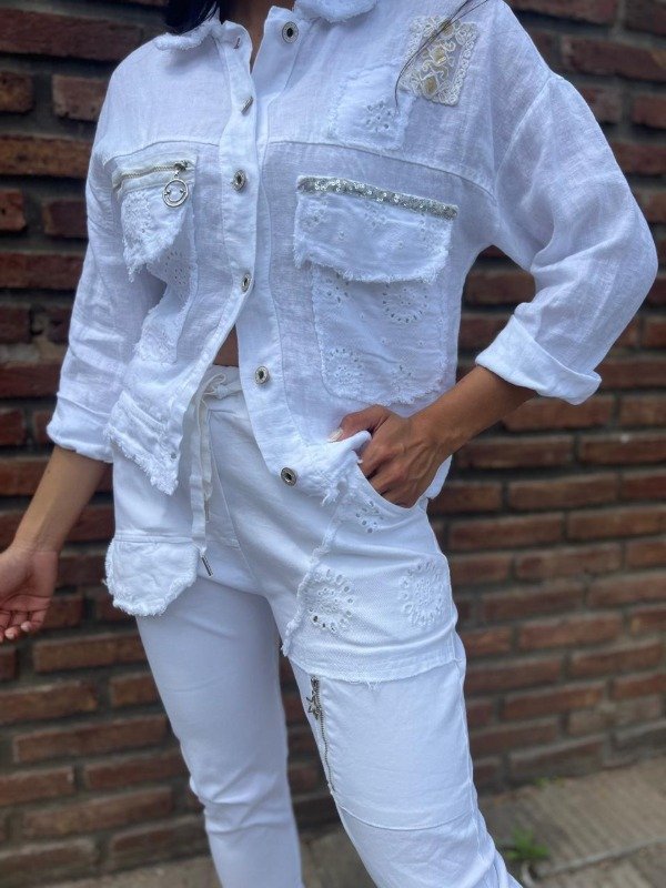 La chaqueta, de corte corto y oversize, está confeccionada en un tejido de lino o mezcla de algodón/lino blanco y presenta una estética desgastada. Su diseño imita una chaqueta denim o militar, pero con un toque femenino dado por los detalles: posee bolsillos de parche frontales con bordes deshilachados y rotos, que revelan un bordado calado subyacente. Los hombros están adornados con un aplique de encaje y los bolsillos del pecho están rematados con una franja horizontal de lentejuelas plateadas o strass, añadiendo un brillo inesperado. La chaqueta se cierra con botones metálicos de diseño envejecido y las mangas se llevan arremangadas a una longitud de tres cuartos. El pantalón es de corte babucha, confeccionado en el mismo tejido blanco de alta calidad para mantener la coherencia del conjunto. Su silueta es ajustada con un cómodo elástico en la cintura y cordones. El diseño en la parte superior y las piernas sigue la misma estética deconstruida de la chaqueta: presenta aplicaciones de tela con bordado calado y deshilachados, así como detalles de cierres metálicos funcionales y decorativos que refuerzan el estilo moderno de la prenda. Este conjunto es una declaración de moda. Es perfecto para un look de día de verano, festivales o eventos casuales donde se quiera destacar. La mezcla de la textura rústica del lino, la artesanía del bordado calado y los elementos metálicos y de brillo (lentejuelas/strass) lo convierten en una pieza versátil que puede usarse junto para un impacto total o por separado.
