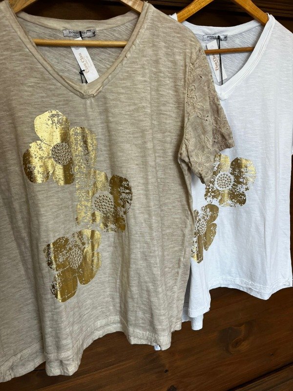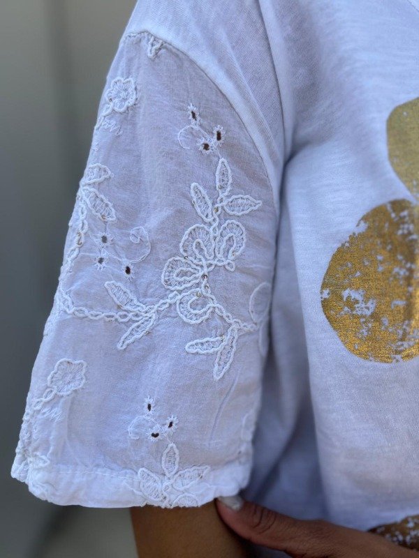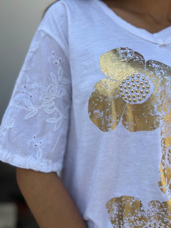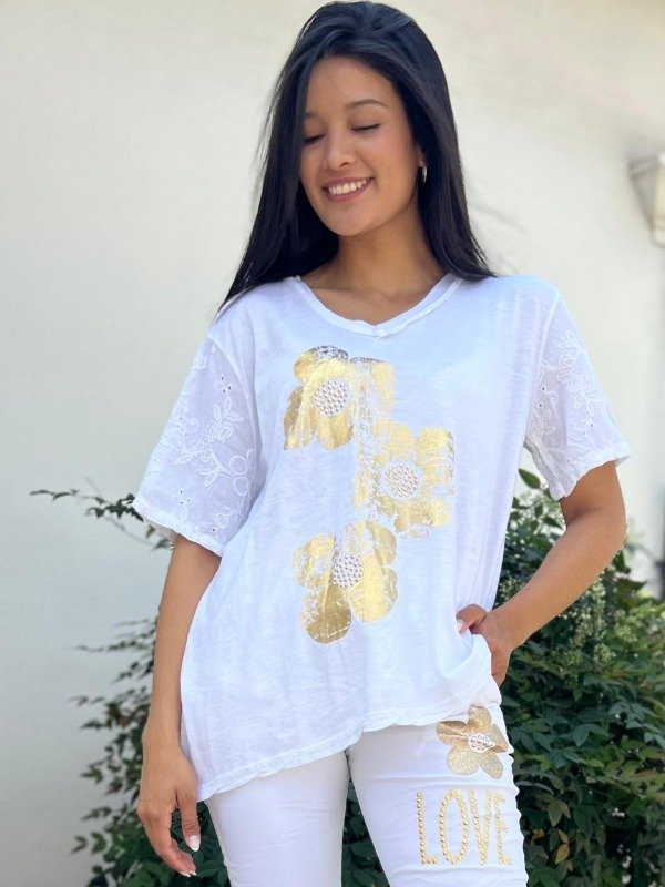 Esta es una remera de alta calidad importada de Italia, que fusiona la comodidad del algodón con un diseño de lujo casual y toques artesanales. Es la pieza perfecta para quienes buscan un look veraniego, fresco y brillante. La remera está confeccionada en algodón italiano, lo que garantiza una textura suave, ligera y muy fresca. El corte es relajado y amplio, lo que asegura un ajuste cómodo y una caída favorecedora para la silueta. Cuenta con un escote en V suave y abierto, ideal para estilizar el cuello. La remera se distingue por dos elementos principales que le dan textura y carácter: la estampa frontal y los detalles en las mangas. El centro de la remera está dominado por un llamativo estampado de flores en foil dorado. El foil es una técnica que da un acabado metálico y brillante, simulando un pan de oro con una textura ligeramente rugosa, lo que le da un toque moderno y menos perfecto. El diseño consiste en un conjunto de flores grandes, dispuestas de forma artística y orgánica. El centro de cada flor estampada está decorado con pequeñas tachas doradas en relieve. Estos detalles crean un corazón brillante para cada flor, añadiendo una dimensión de lujo discreto y haciendo que la prenda capte la luz de forma espectacular. Un rasgo distintivo y sofisticado se encuentra en las mangas. Estas están confeccionadas en un tejido ligeramente diferente o con una aplicación de bordado calado en el mismo tono. Este bordado es de motivos florales o de hojas, y los pequeños calados permiten un extra de ventilación, además de aportar un toque romántico y artesanal que contrasta con el brillo moderno del foil. Las mangas son cortas y de caída suave.