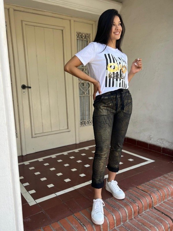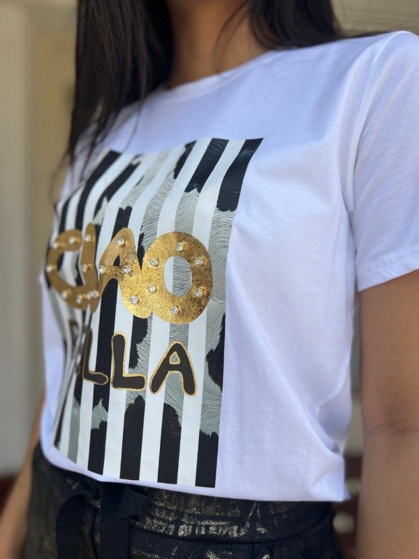 Las letras de "CIAO" están resaltadas con un acabado metálico dorado o glitter dorado, dándoles un aspecto de pan de oro.Sobre las letras C, A, O y la B de "BELLA" se encuentran aplicados pequeños strass, incrustados en el dorado. Esto proporciona un brillo tridimensional que capta la luz con cada movimiento. Las letras de "BELLA" (bajo el strass) tienen un borde negro definido sobre el fondo gráfico. Esta remera es perfecta para un look urbano y moderno. La combinación de algodón blanco con el estampado animal print y los destellos dorados la hace ideal para elevar un conjunto casual. Combina fantásticamente con pantalones negros engomados, jeans, o faldas, y es una pieza que transmite energía y actitud.