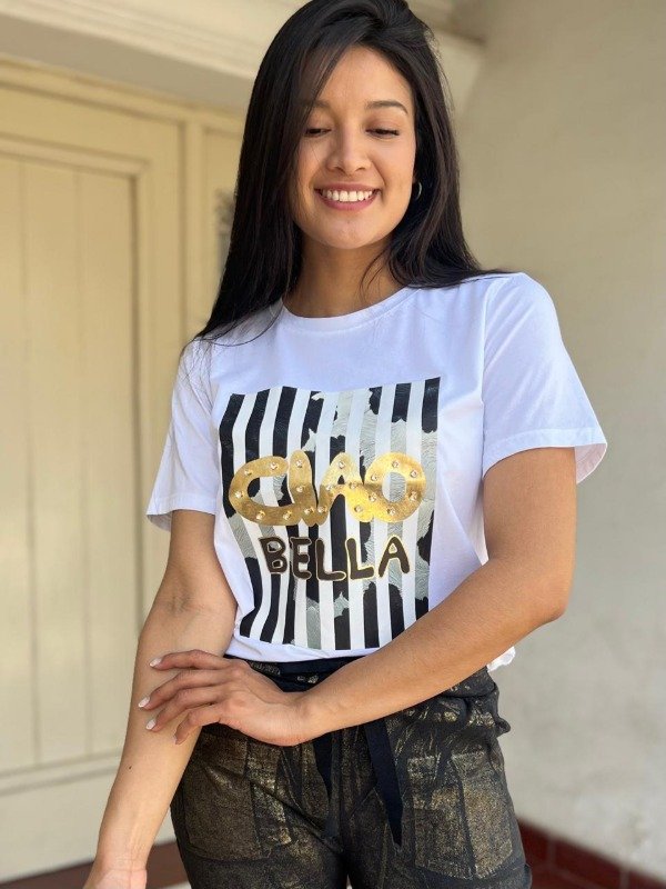 Presenta un corte recto y clásico (regular fit) que favorece la figura. Tiene un escote redondo de grosor estándar y mangas cortas de ajuste tradicional. La estampa se enmarca en un rectángulo vertical que combina dos patrones llamativos: La base del diseño presenta rayas gruesas verticales en blanco y negro, aportando un contraste fuerte y clásico. Por debajo de las rayas (o integrado en ellas) se percibe un sutil patrón animal print (posiblemente leopardo o camuflaje) en tonos de gris y negro, añadiendo profundidad y tendencia. La frase destacada es "CIAO BELLA", un popular saludo italiano.