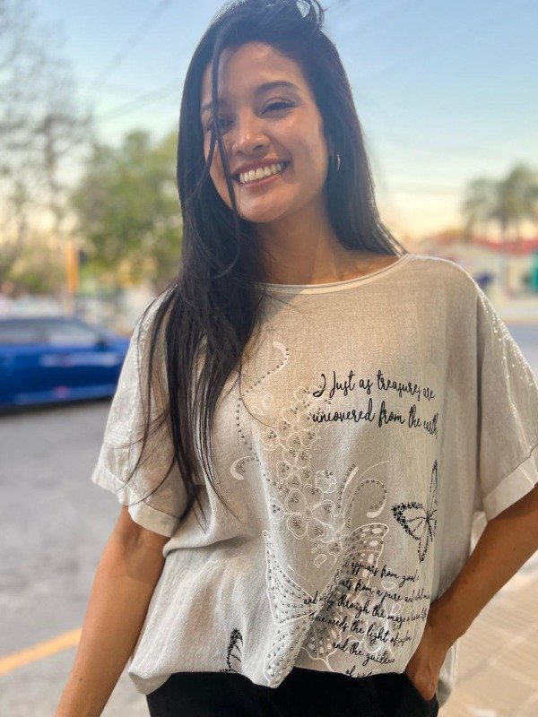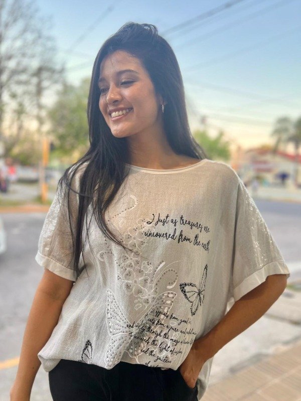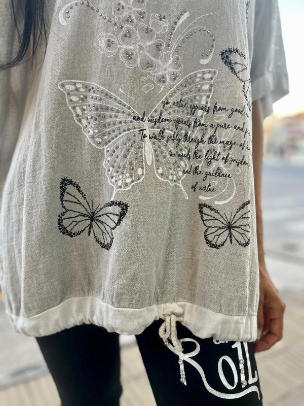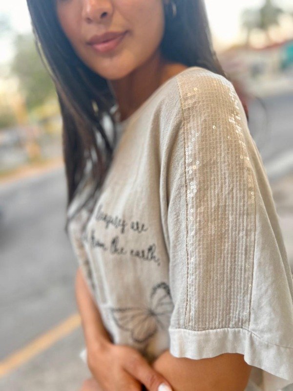 Presenta un gran estampado frontal que combina ilustraciones de mariposas y motivos florales con una tipografía manuscrita y poética. Los bordes de las mariposas y el centro de los motivos florales están adornados con pequeños strass que añaden un brillo sutil y dimensional al diseño. Las mangas son cortas y presentan un contraste de textura, ya que están confeccionadas o cubiertas con lentejuelas finas y discretas en el mismo tono neutro o plata muy pálida. Este detalle eleva la prenda de una simple remera a una pieza de outfit. La parte inferior del cuerpo presenta un dobladillo con un jareta o cordón ajustable, permitiendo fruncir la tela para lograr un efecto más abombado o acortar ligeramente el largo, adaptándose a diferentes looks.