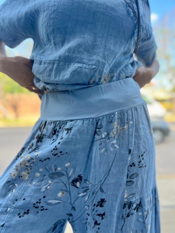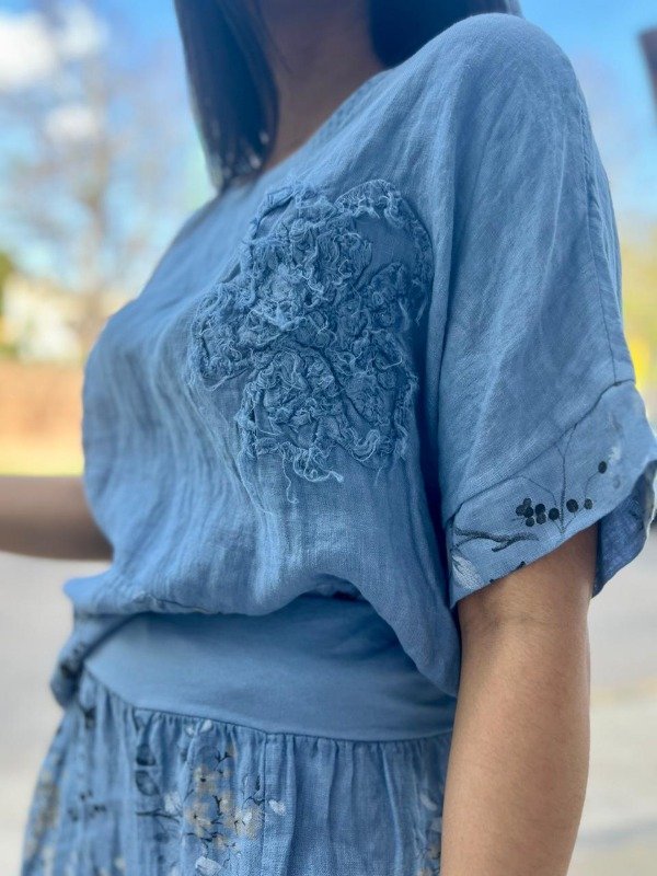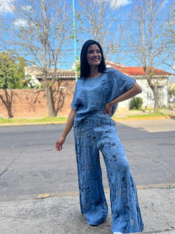 Este es un conjunto importado de Italia de diseño exclusivo, que fusiona la comodidad de las fibras naturales con una estética moderna y monocromática, ideal para un look sofisticado y relajado. Ambas prendas están confeccionadas en un lino ligero de alta calidad, teñido en un hermoso color azulino, lo que le da un aspecto suave y fresco. La blusa es holgada (estilo oversize), con un escote redondo simple y mangas cortas de corte recto o ligeramente caído, lo que asegura un ajuste cómodo y ventilado. Presenta un detalle tridimensional en el pecho, que es un aplique fruncido o bordado de hilo formando un patrón orgánico o floral, añadiendo textura y un toque artesanal.