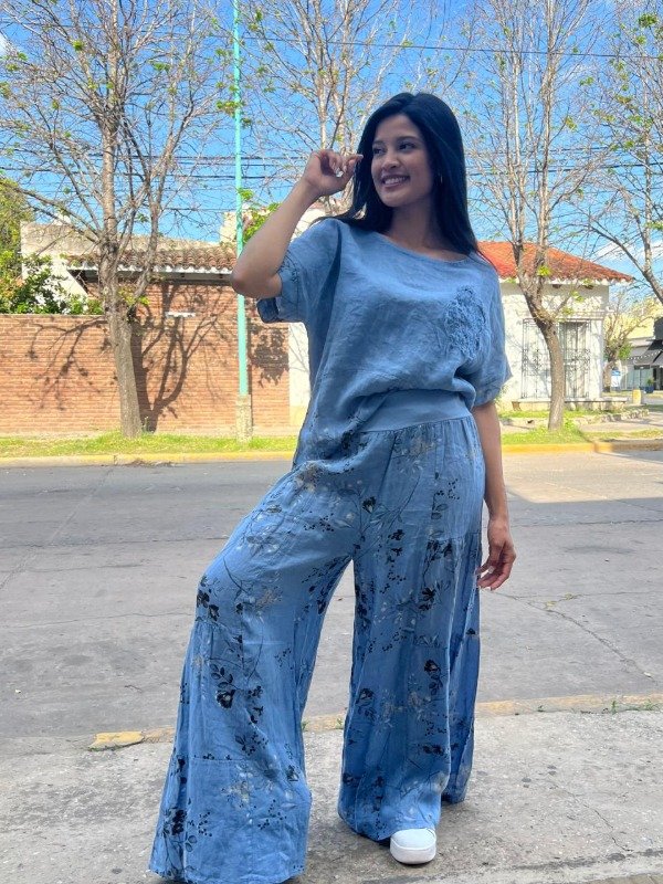 El pantalón es de corte palazzo, con pierna ancha y caída fluida, lo que estiliza la figura y garantiza máxima comodidad y movimiento. Su diseño se destaca por un estampado sutil y tonal en la parte inferior, con motivos botánicos o florales en tonos de gris claro, blanco roto y negro carbón, que crean un contraste delicado con el azul de la base. La cintura es alta y ancha, probablemente con elástico ideal para adaptar a los distintos talles y sin botones visibles, lo que mantiene el look limpio y cohesivo.