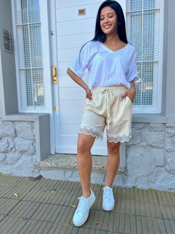 Este es un short de estilo boho-chic, importado de Italia, que se distingue por su materialidad fresca y sus delicados toques artesanales. Confeccionado en un tejido ligero, probablemente lino o una mezcla de lino y algodón, el short presenta un color beige arena o crema de base natural, con un sutil efecto metalizado dorado integrado en la tela. Este brillo tenue le da un aire de sofisticación que lo eleva por encima de un short de lino tradicional. El corte es recto y relajado, con un largo que llega a medio muslo, ideal para la comodidad en climas cálidos. La cintura es elástica y ajustable, con un cordón de ajuste en color crema que permite adaptarlo perfectamente a la figura, y cuenta con bolsillos laterales funcionales. El detalle más encantador reside en el ruedo o bajo, que está adornado con una franja ancha de puntilla o encaje de guipur en color blanco roto o crema. Esta puntilla presenta un patrón floral y festoneado, que aporta un acabado sumamente femenino y artesanal, contrastando la rusticidad del lino con la delicadeza del encaje. Esta prenda es la base perfecta para un look de día casual o de playa, combinando maravillosamente con blusas blancas y sandalias.