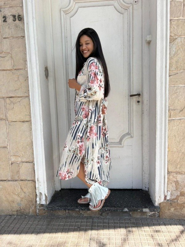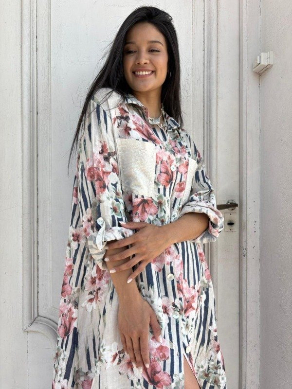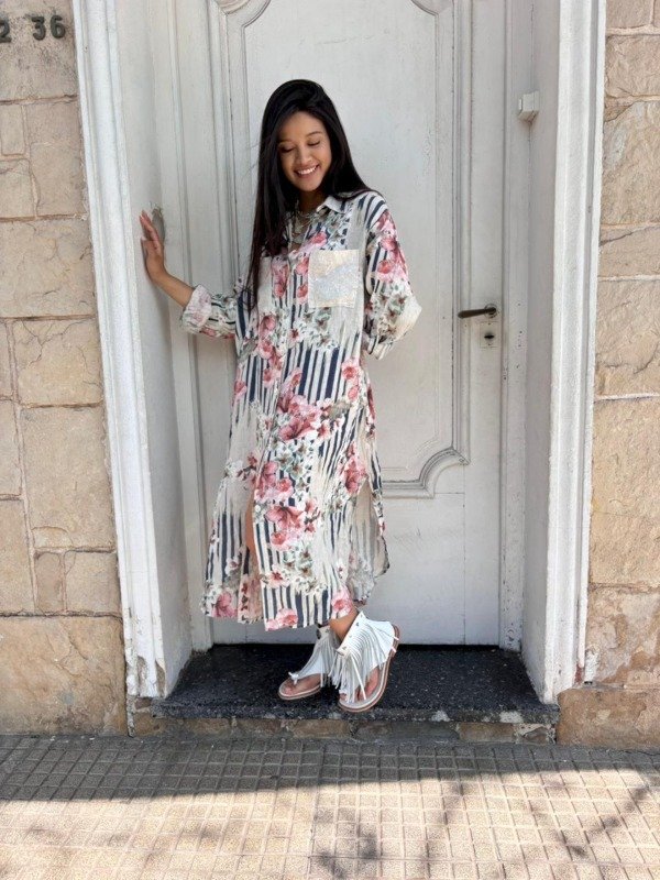 Su largo maxi y el corte camisero con aberturas laterales permiten múltiples usos: llévalo cerrado como un vestido elegante, o desabrochado como un kimono o cárdigan ligero sobre jeans y tops.