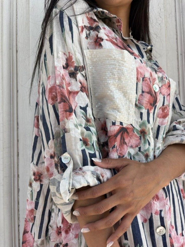El estampado es una obra de arte. Combina románticas flores en tonos malva, rosa y verde con rayas verticales en azul marino y crema. Esta mezcla de patrones es moderna, atrevida y, a la vez, increíblemente favorecedora.