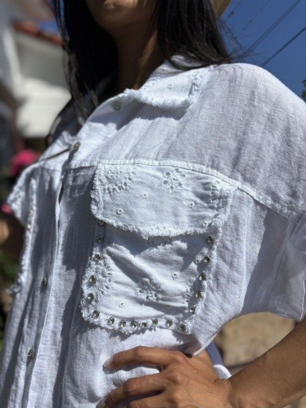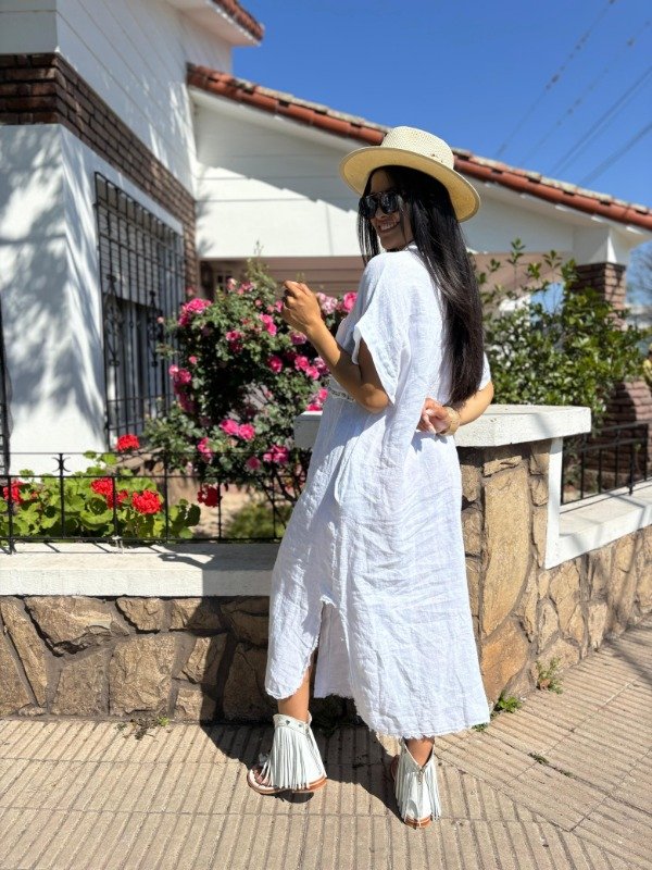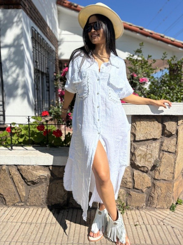 Este vestido es una pieza imprescindible para el verano, combinando la frescura y la calidad del lino italiano con un diseño moderno que incorpora elementos desgastado y toques de brillo. Es perfecto para un estilo resort o boho-chic de día. Confeccionado en 100% Lino Italiano, lo que garantiza un tejido de la más alta calidad: ligero, extremadamente transpirable, y con la textura natural y la caída elegante característica de la fibra. Blanco puro, ideal para reflejar la luz del sol y realzar el bronceado. Presenta una silueta recta y relajada, de corte oversize que asegura un ajuste cómodo y amplio. Cae de forma fluida a lo largo del cuerpo.Largo midi (a media pantorrilla o tobillo, según la altura), ofreciendo una cobertura sofisticada. La estructura del vestido se basa en una camisa larga, pero está enriquecida con detalles de diseño que le dan un carácter único. Posee un cuello camisero clásico con solapa. Cuenta con una abertura frontal completamente abotonada (botón a botón), desde el cuello hasta el bajo. El diseño, facilita el movimiento y tiene un toque moderno. El dobladillo es asimétrico e irregular, con una línea de corte desigual y un marcado acabado deshilachado que le confiere un estilo boho y ligeramente rústico. Las mangas son cortas y amplias, aumentando la sensación de holgura y frescura. Cuenta con dos bolsillos de parche frontales en el pecho.Los bordes de los bolsillos superiores presentan un fuerte acabado deshilachado y desgastado, dándole un look deconstruido Se aprecian pequeños calados y bordados discretos sobre los bolsillos y cerca de ellos, reforzando la sensación artesanal. El borde inferior de los bolsillos está realzado con una línea de strass, que introducen un contraste de brillo sutil sobre el material natural del lino.