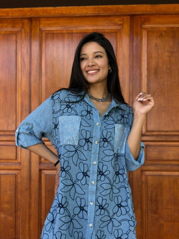 Diseño Versátil: El corte es recto y relajado (estilo oversize), con un bajo que llega por encima de la rodilla y aberturas laterales. Llévalo abotonado como vestido o abierto, sobre un top y shorts, como una maxi-camisa o cárdigan ligero.