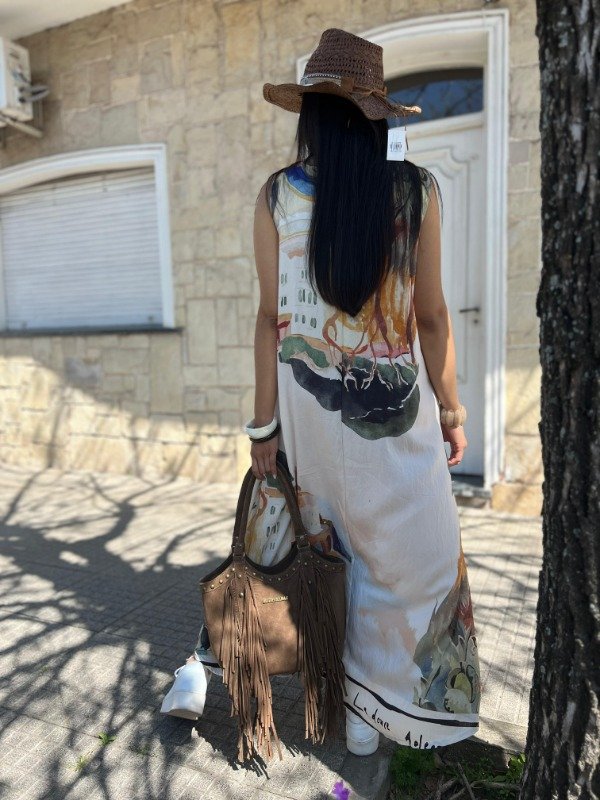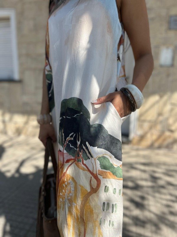 Déjate envolver por la esencia del arte con el VESTIDO ITALIANO THE CITY. Confeccionado en tela de crep. Esta prenda ofrece una caída lujosa y un tacto increíblemente suave que acaricia la piel. El protagonista es su estampado artístico que simula una pintura de acuarela con paisajes, casas y naturaleza en tonos cálidos y tierra.