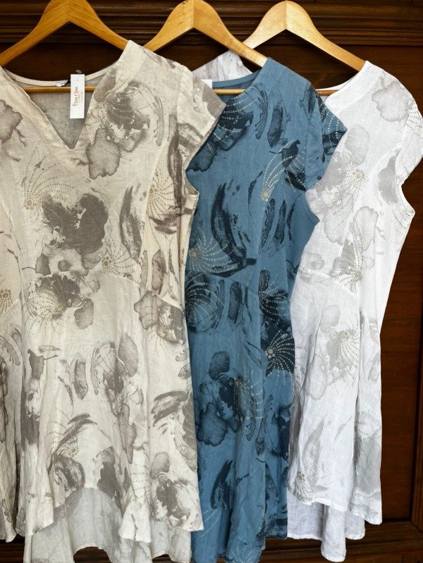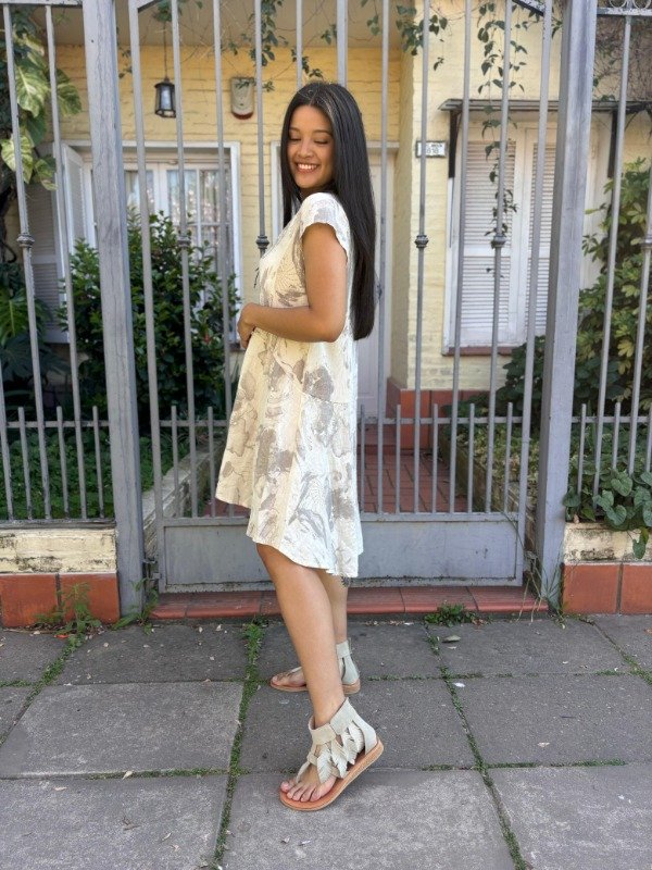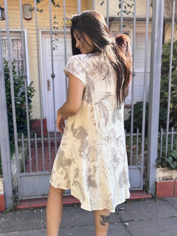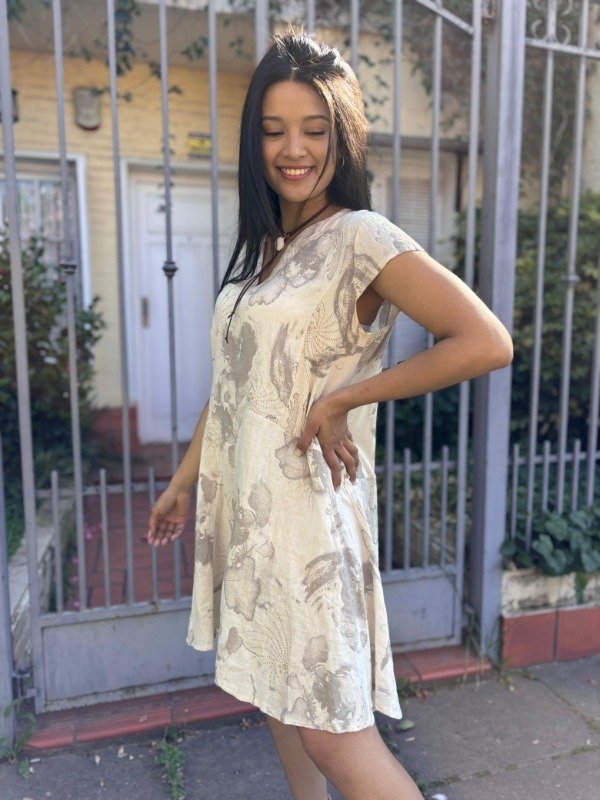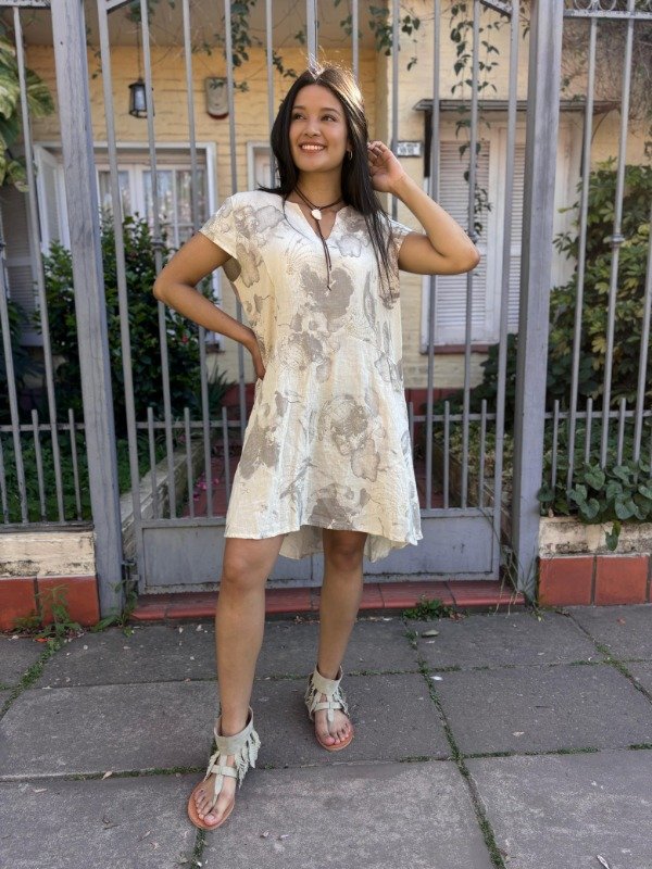 Este es un vestido de diseño italiano que fusiona la frescura de las fibras naturales con un estampado de inspiración artística y una silueta femenina y cómoda. Ideal para el estilo boho-chic elevado y el uso diario de primavera/verano. Confeccionado en una exquisita mezcla de Lino importado y 100% Algodón. Esta combinación garantiza una tela transpirable, suave al tacto y con la caída texturizada característica del lino, perfecta para climas cálidos. Presenta un estampado artístico y abstracto en tonos neutros y tierra . El diseño parece evocar motivos florales, manchas orgánicas o mapas abstractos, confiriéndole un aire de acuarela difusa y sofisticada. El vestido sigue la línea del estilo Jackie, refiriéndose a un corte clásico de silueta , que es elegante, atemporal y favorecedor. Presenta un corte que cae suavemente desde el pecho o los hombros, con una silueta relajada y holgada que no se ciñe al cuerpo, ofreciendo absoluta comodidad. El largo es por encima de la rodilla . El bajo es redondeado y levemente asimétrico (más corto a los lados o con una ligera curva), lo que añade movimiento y fluidez. Cuenta con un escote en V suave que alarga la figura, a menudo terminado con un pequeño detalle de costura o un lazo decorativo (visible en el cuello del modelo). Posee mangas cortas, que cubren ligeramente los hombros y contribuyen a la silueta juvenil. Es una prenda versátil que se adapta fácilmente. Puede llevarse con sandalias planas o de flecos (como se muestra) para un look casual y bohemio, o con cuñas y accesorios en tonos dorados para una ocasión más arreglada.