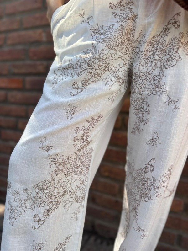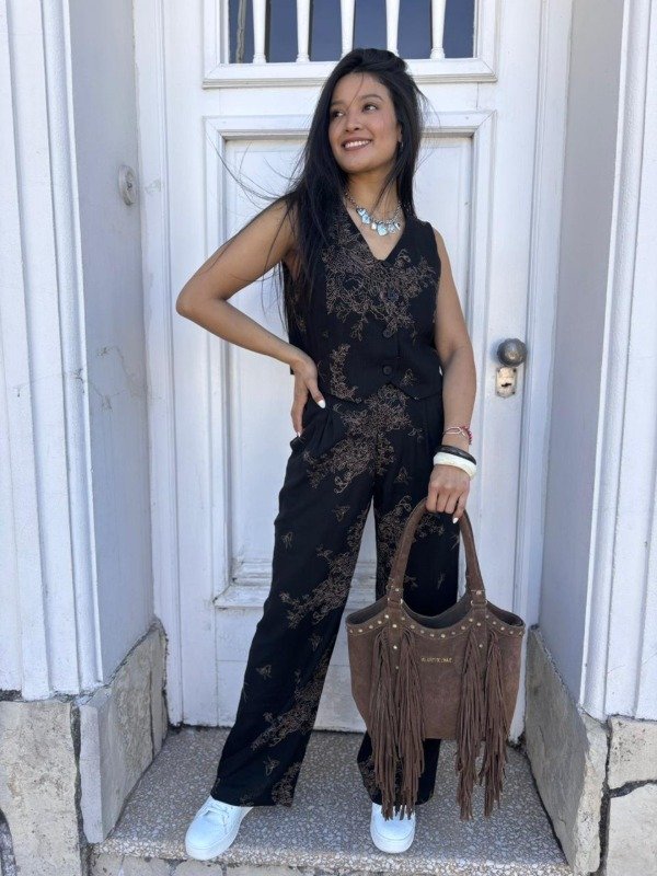 El verdadero corazón de este conjunto reside en sus bordados. Un intrincado diseño de flores, ramas y mariposas en tonos marrones y dorados se extiende armoniosamente por ambas prendas. Cada puntada ha sido cuidadosamente elaborada para crear un patrón orgánico y vivo que evoca la belleza de un jardín secreto.