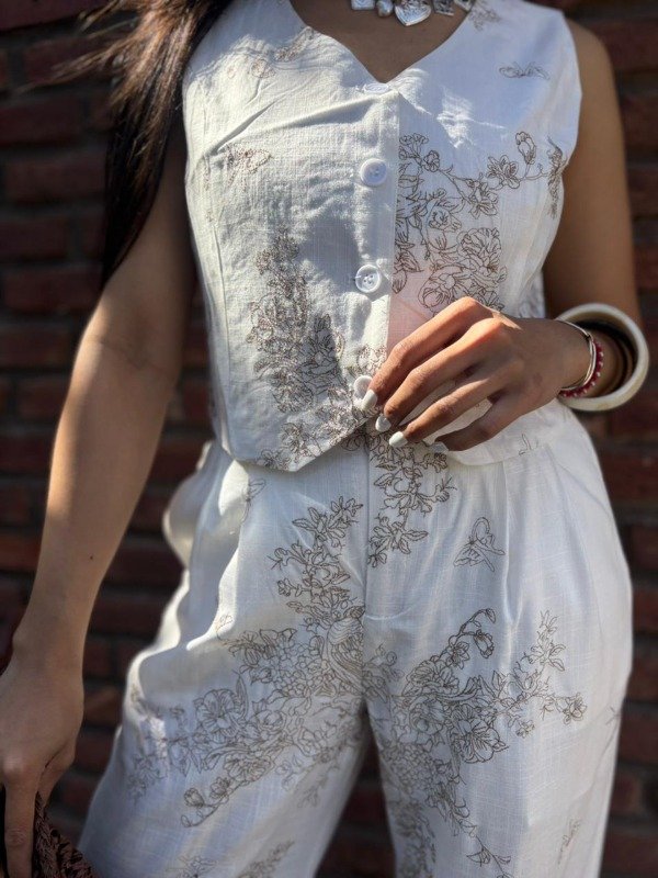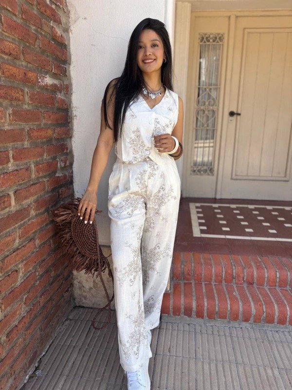 Úsalo con unas zapatillas blancas para un look casual y cómodo de día, o combínalo con sandalias de tacón y accesorios dorados para una ocasión especial por la noche. Su versatilidad te permite llevar el top o el pantalón por separado, multiplicando las opciones de tu guardarropa. El chaleco es perfecto para usar con jeans de tiro alto, mientras que el pantalón puede combinarse con una blusa básica para un outfit más sencillo.