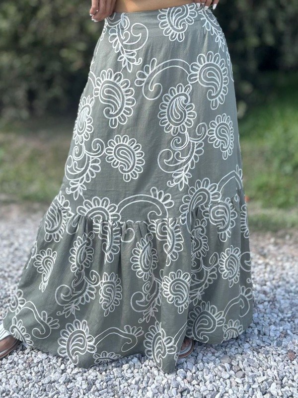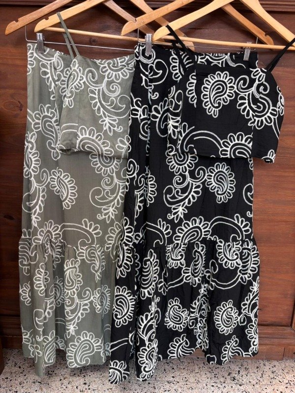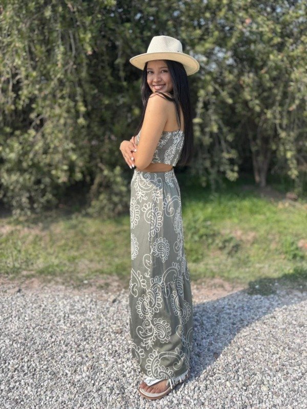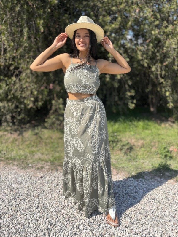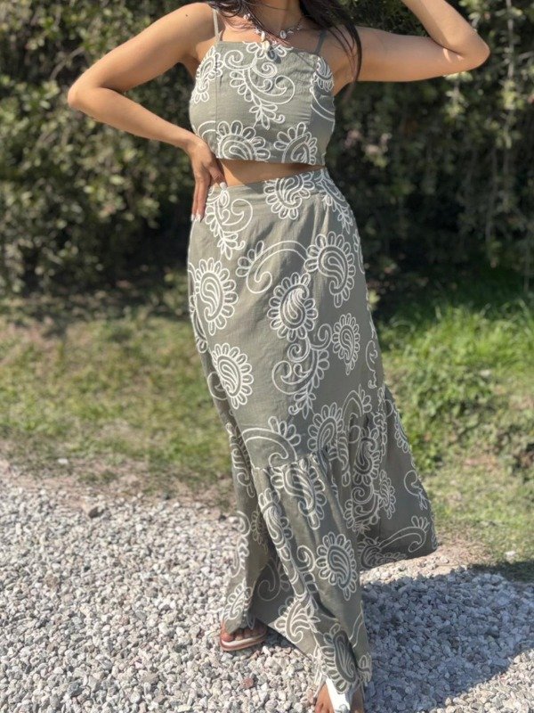 Elaborado en un suave y fresco tejido de color verde olivo, este conjunto es perfecto para los días cálidos. El estampado de flores de cachemira en hilo blanco crea un contraste visual hermoso y delicado, dándole un toque artesanal y sofisticado. El top tipo crop top, con tirantes finos, presenta un escote recto que estiliza tu figura y se ajusta cómodamente. La falda larga, de corte fluido, cae con gracia hasta los tobillos, permitiendo un movimiento natural y etéreo. El detalle del volante fruncido en la parte inferior de la falda añade un toque extra de dinamismo y feminidad.