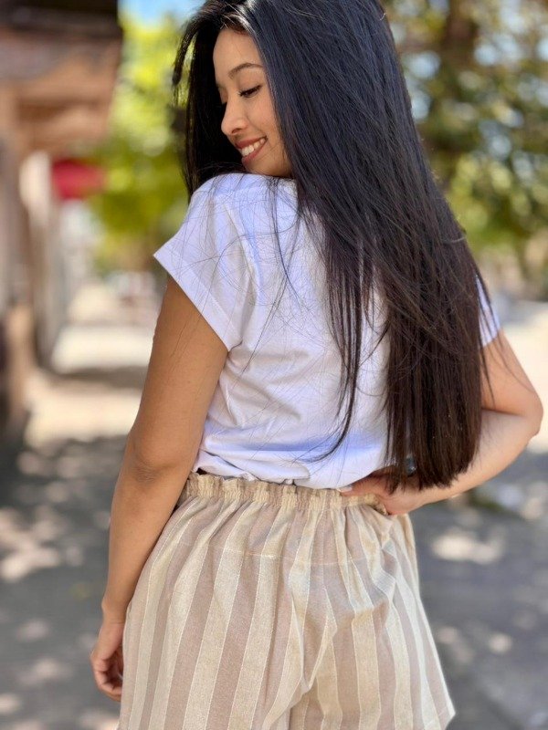 Este short es increíblemente versátil. Llévalo como en la foto con una camiseta básica blanca y zapatillas para un look de día relajado. Para una salida de tarde o brunch, cámbialo por unas sandalias de cuña y un top de tirantes lencero. ¡Es ideal tanto para un paseo por la ciudad como para la costa!