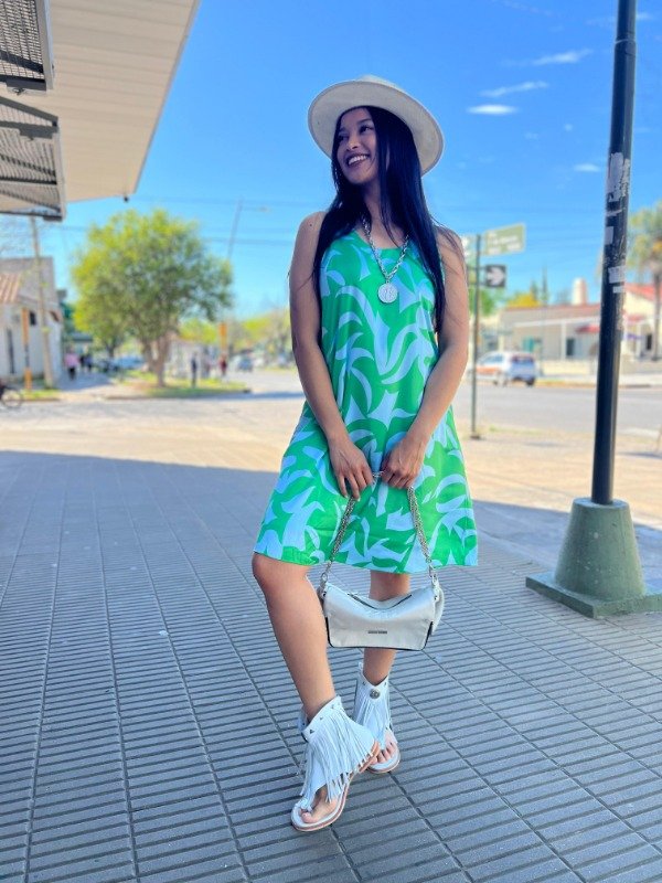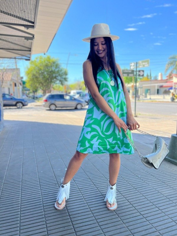 Deslumbra con el VESTIDO SOLERO TROPICAL. Este diseño de silueta suelta y juvenil es la definición de la frescura chic. Confeccionado en seda ligera, presenta un vibrante estampado orgánico en tonos de verde esmeralda y celeste, perfecto para el calor. Su corte A y el largo ideal lo hacen versátil para el día o la noche. La tela de seda garantiza una caída impecable y un tacto suave que te encantará. Combínalo con sandalias o botines, y un sombrero fedora para un look boho-playero inigualable.