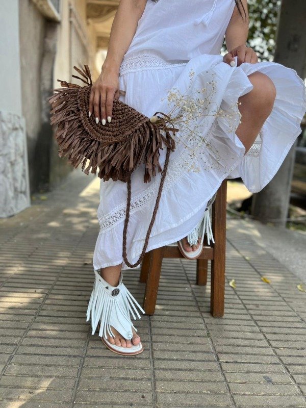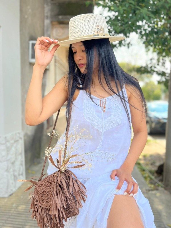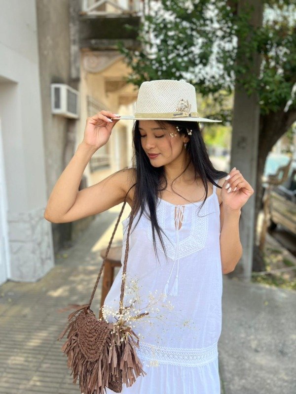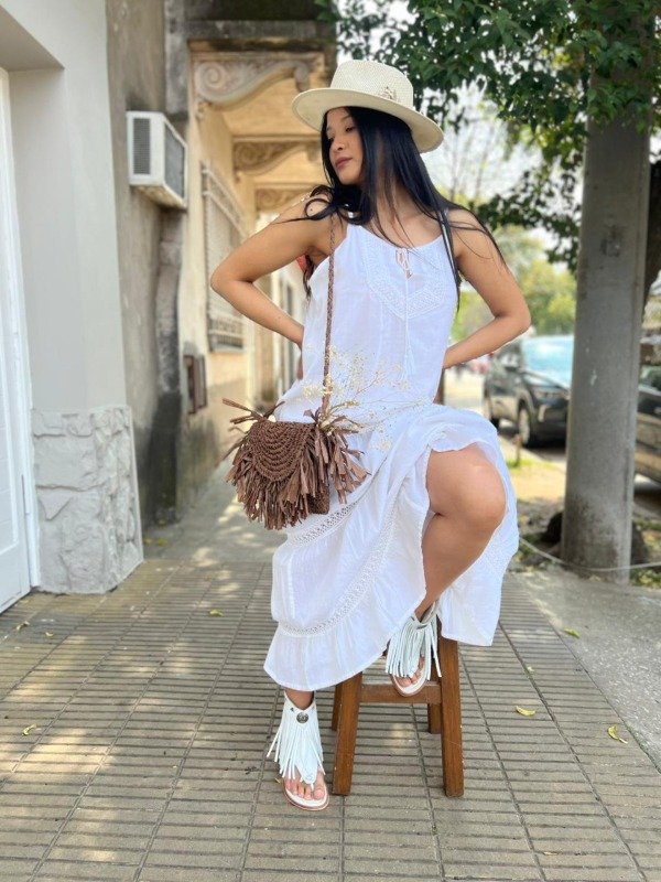 El look completo que se muestra en las fotos es muy coherente con el estilo boho-chic, combinando el vestido con un sombrero de paja, una cartera de flecos y flores, y unas sandalias con flecos, creando un conjunto ideal para el verano o vacaciones.