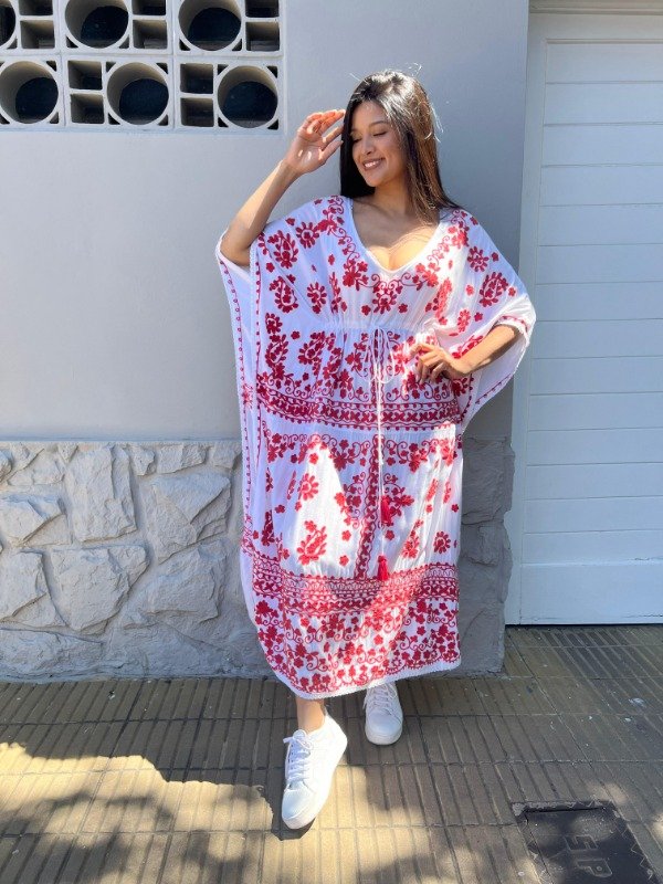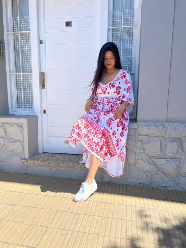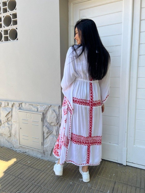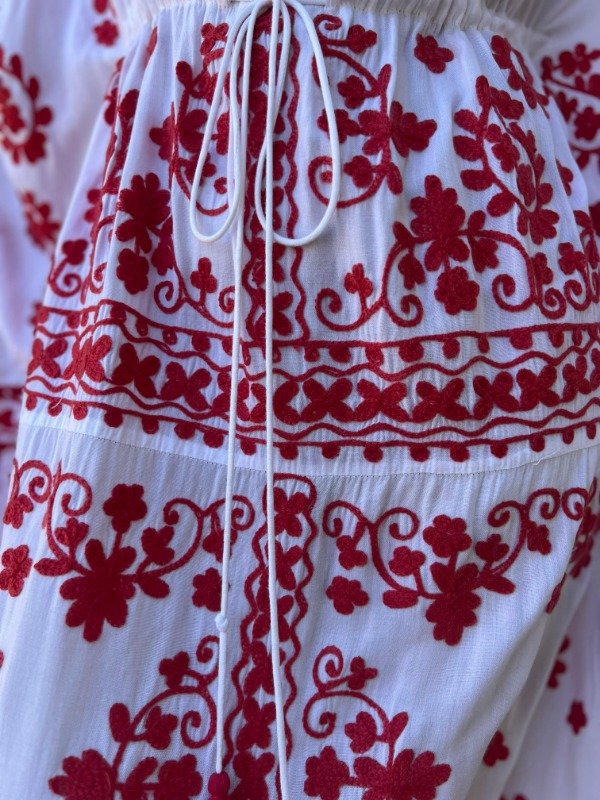 Confeccionado en un tejido ligero y fresco (algodón o mezcla suave), destaca por su impresionante bordado floral en hilo rojo intenso sobre fondo blanco puro. El bordado abunda en el escote, la cintura y el ruedo, dándole un aire tradicional y vibrante.
